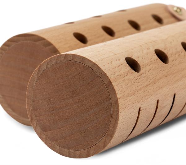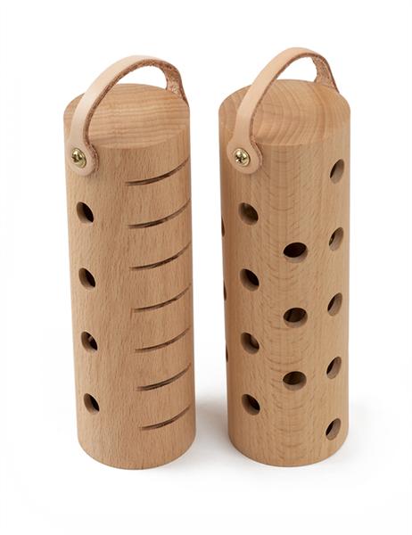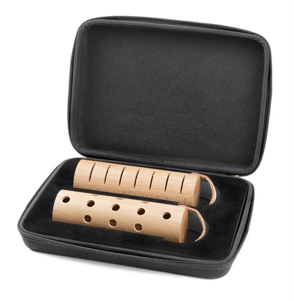 Hier klingt die reine Kraft des Holzes! Unterschiedliche Designs der Resonanzlöcher sorgen für eine volle Klangprojektion. Die Buchenholz-Tubes sind mit Hardwood-Stäbchen befüllt. Verschieden starke Wandungen erzeugen akzentstarke High- & Low-Sounds. So kannst du beide Tubes als kommunizierendes Shaker-Pärchen spielen.