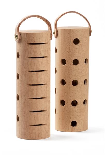 Hier klingt die reine Kraft des Holzes! Unterschiedliche Designs der Resonanzlöcher sorgen für eine volle Klangprojektion. Die Buchenholz-Tubes sind mit Hardwood-Stäbchen befüllt. Verschieden starke Wandungen erzeugen akzentstarke High- & Low-Sounds. So kannst du beide Tubes als kommunizierendes Shaker-Pärchen spielen.