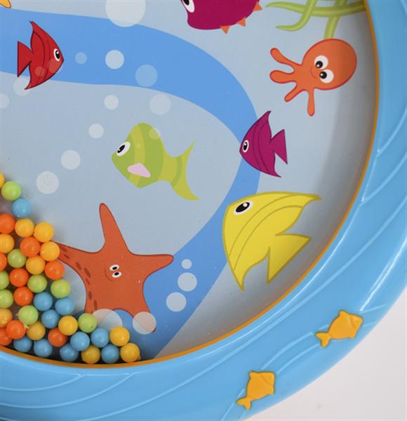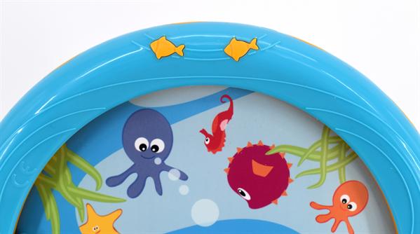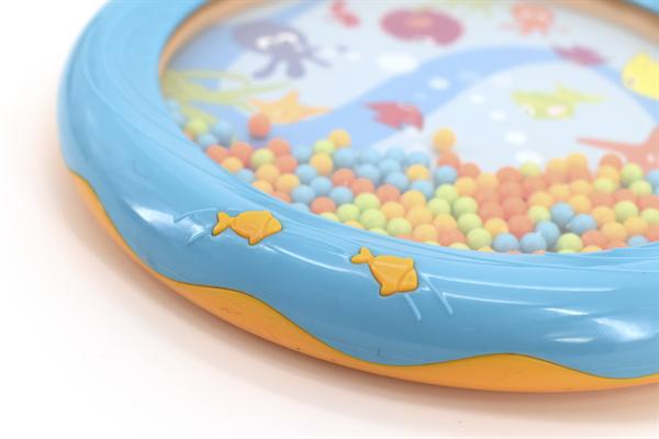 Leicht kippen und lauschen, wie die bunten Kügelchen sich in der flachen Meerestrommel mit einem Rauschen über die lustigen Fischapplikationen hinweg bewegen, das macht Spaß. Auch als Rassel lässt sich die Meerestrommel wunderbar einsetzen.