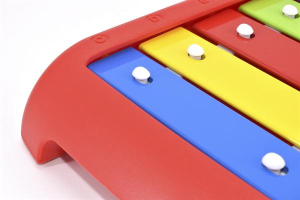 Die 8 Klangplatten mit den Tönen von C–C (diatonisch) aus hochwertigem Aluminium sind in den Rahmen eingelassen, so dass keine Ecke oder Kante mehr erreichbar ist. Der laute und klare Klang begeistert auf Anhieb und der unverwüstliche Plastikschlägel findet seinen Platz auf der Rückseite des Glockenspiels – so geht er nicht verloren.