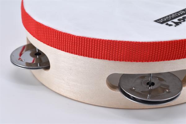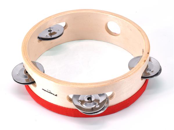 Wooden tambourine with 4 high-quality stainless steel bell pairs featuring a handy finger hole, chamfered bearing edge and durable hygienic plastic drumhead for a strong and clear sound.