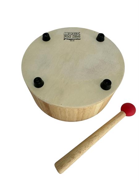 Inklusive ist ein Holz-Schlegel mit Gummikopf, der das Spielen noch angenehmer macht. Die Maße der Trommel betragen ca. 16,5 x 8,5 cm – perfekt für kleine Kinderhände.